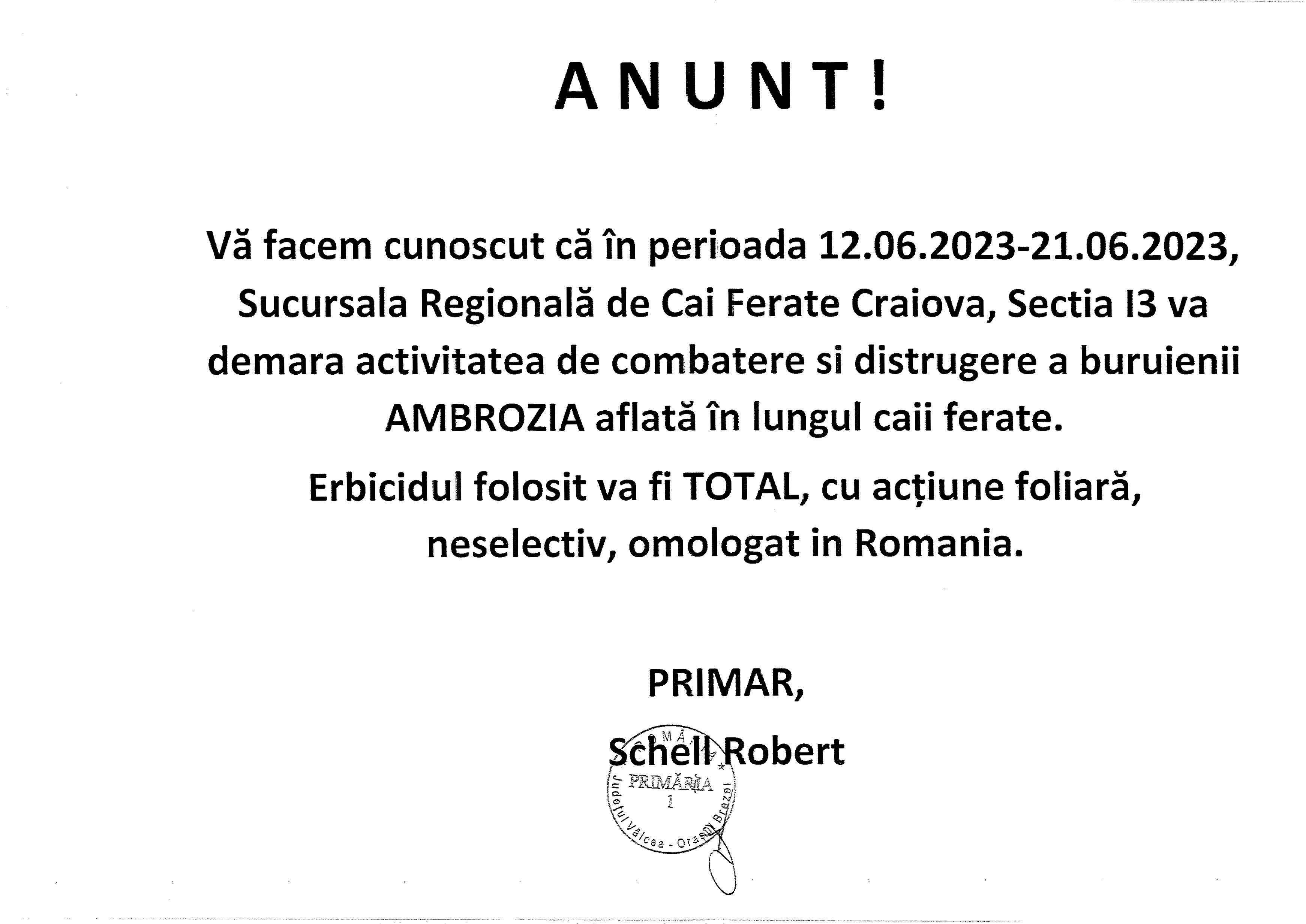 Vă facem cunoscut că în perioada 12.06.2023-21.06.2023, Sucursala Regională de Cai Ferate Craiova, Sectia 13 va demara activitatea de combatere si distrugere a buruienii AMBROZIA aflată în lungul caii ferate.